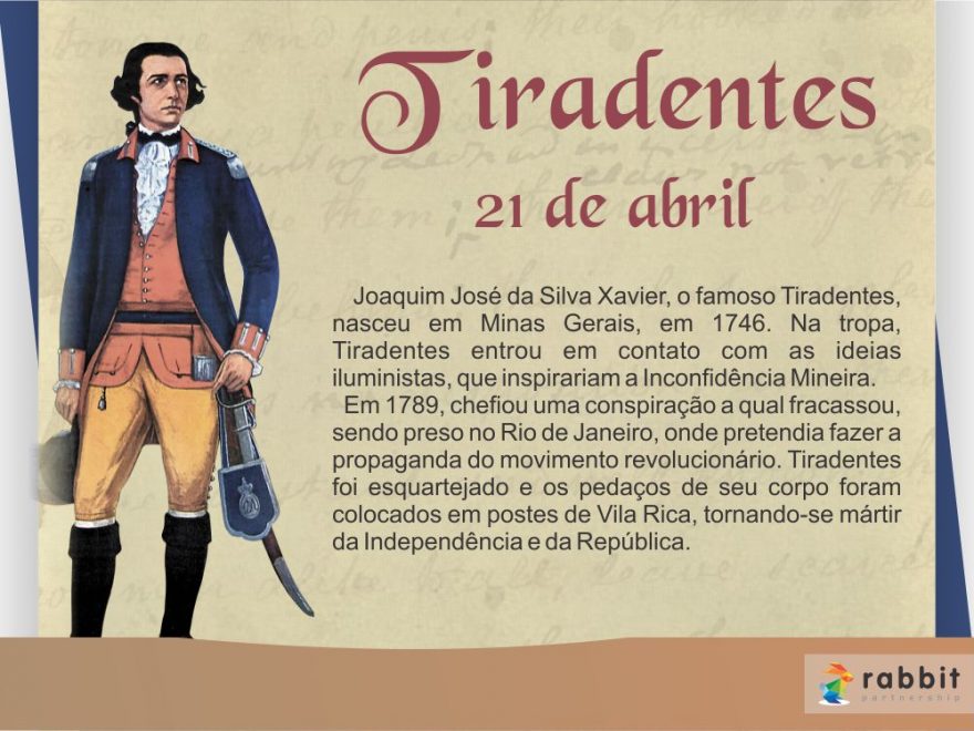 Hoje é o Dia de Tiradentes! Dia 21 de abril remete ao dia da morte do mineiro Joaquim José da Silva Xavier, um dos líderes da Inconfidência Mineira, mais conhecido como Tiradentes. Foi torturado, decapitado e esquartejado por ter traído a coroa portuguesa.